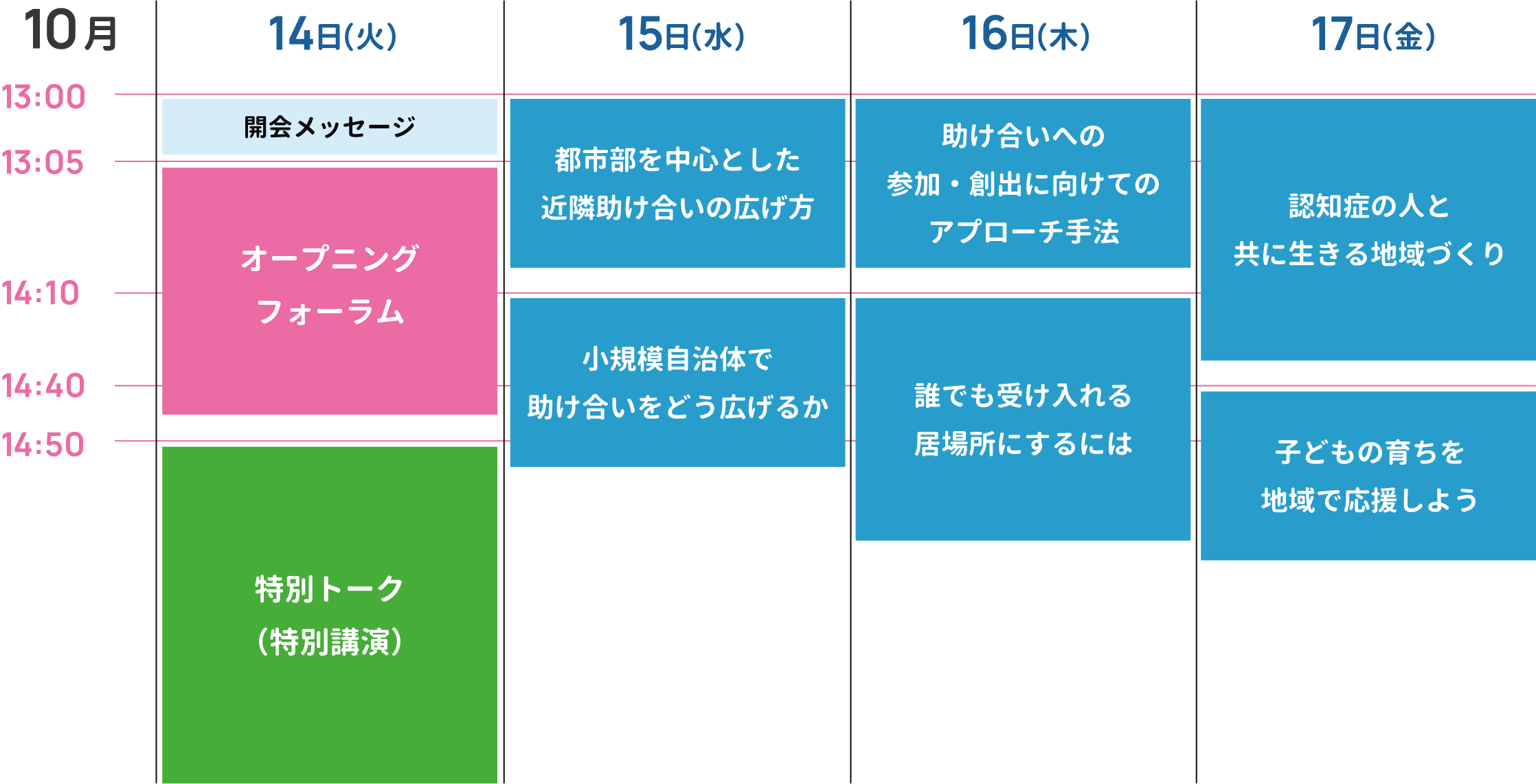 13:00 ― | 開会メッセージ | 都市部を中心とした 近隣助け合いの広げ方 | 助け合いへの参加・創出に向けてのアプローチ手法 | 認知症の人と 共に生きる地域づくり |