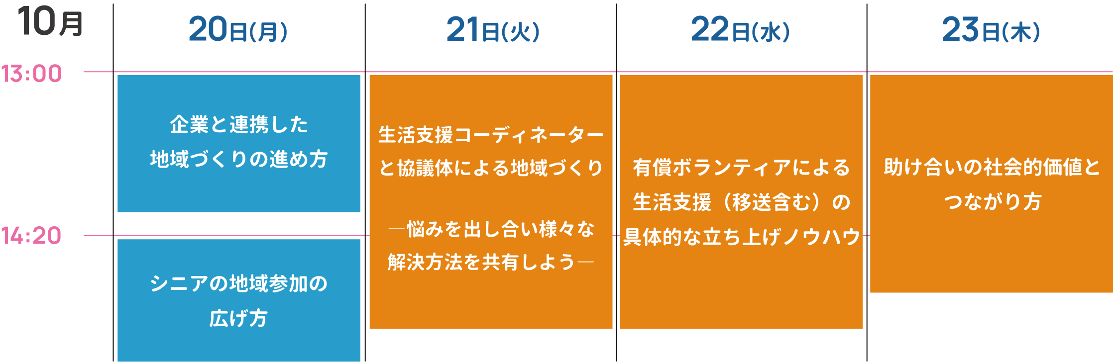 13:00 ― | 企業と連携した 地域づくりの進め方 | 生活支援コーディネーターと協議体による地域づくり ―悩みを出し合い様々な解決方法を共有しよう― | 有償ボランティアによる 生活支援(移送含む)の 具体的な立ち上げノウハウ | 助け合いの社会的価値と つながり方 |